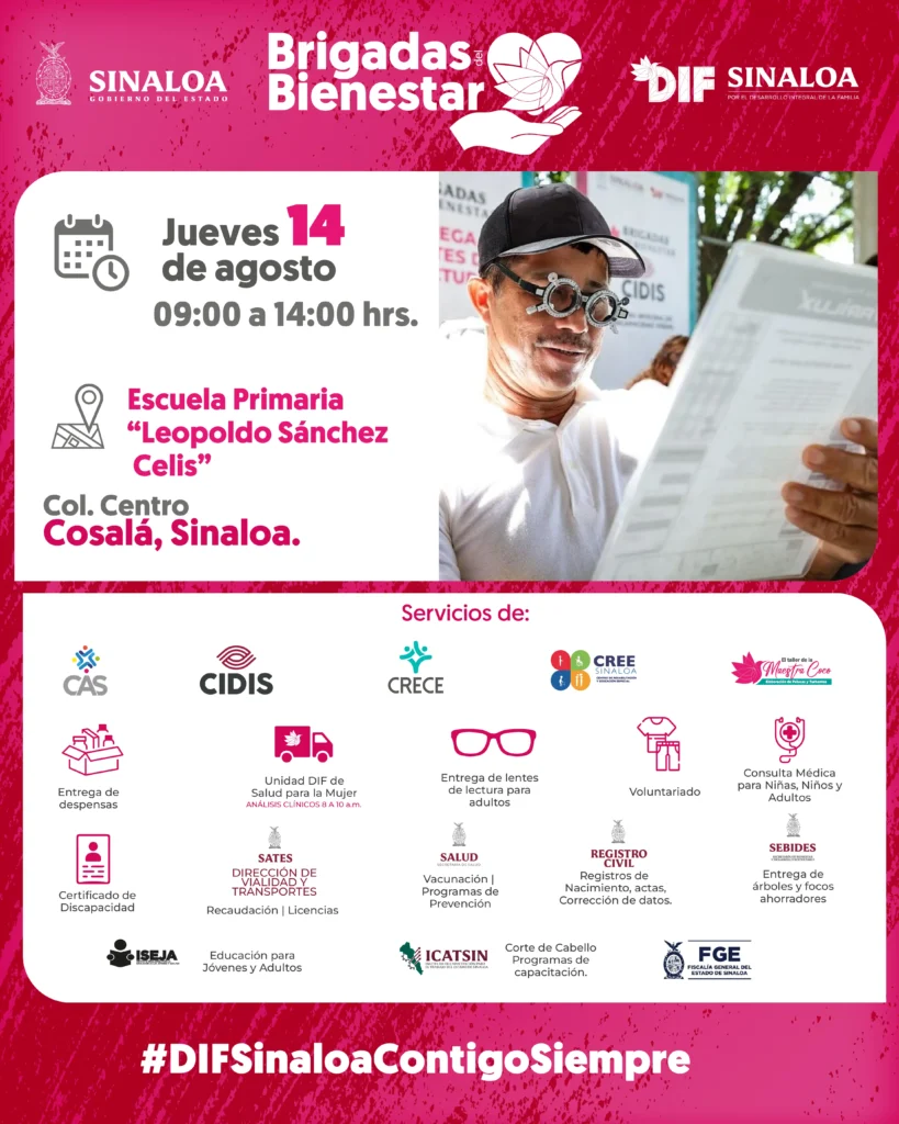 Culiacán, Sinaloa, agosto del 2025.- Con el propósito de atender a la población sinaloenses con servicios de salud, asistencia social y médica, este jueves 14 de agosto llegarán al municipio de Cosalá las Brigadas del Bienestar del Sistema DIF Sinaloa para atender a las familias de manera gratuita y mejorar su bienestar y calidad de vida.
