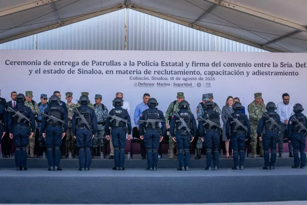 Culiacán, Sinaloa, agosto de 2025.- El respaldo de la presidenta Claudia Sheinbaum Pardo a la estrategia de seguridad en Sinaloa se reafirma con la entrega de 100 patrullas para la Policía Estatal, realizada por autoridades federales y el titular de la Secretaría de Seguridad y Protección Ciudadana, Omar García Harfuch.