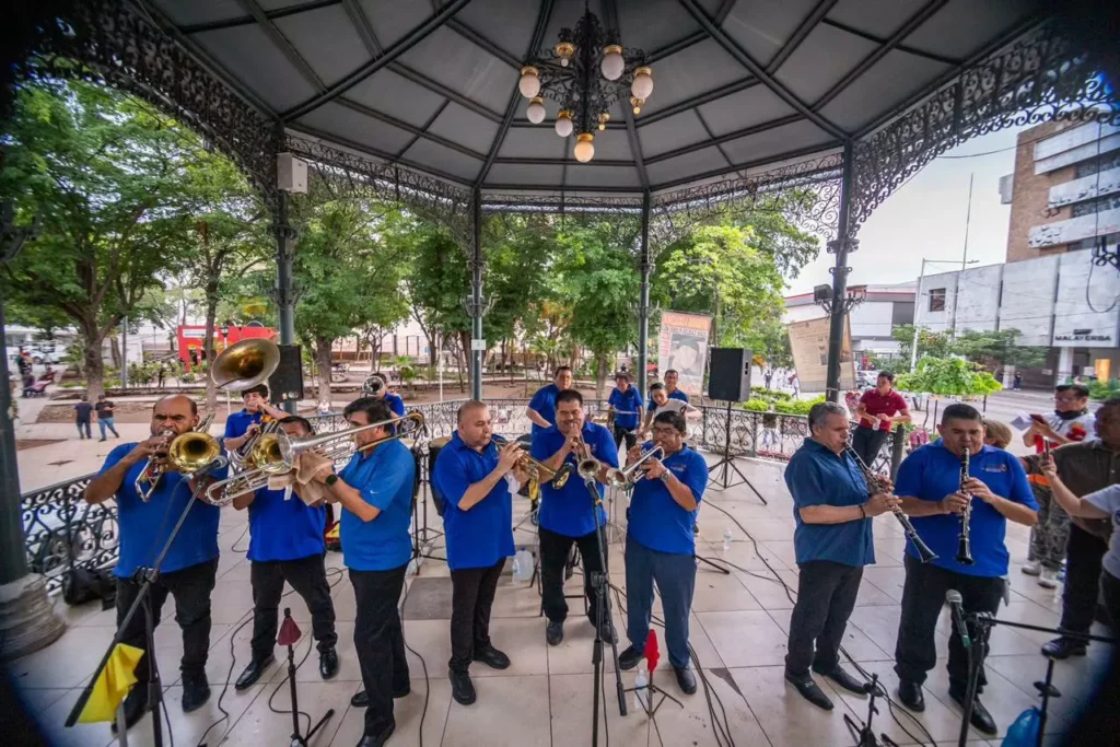 Culiacán, Sinaloa, septiembre de 2025.- Con un ambiente lleno de energía, la Banda Los Porteños de la Sección 34 del Sindicato de Músicos puso a bailar a cientos de ciudadanos en la Plazuela Álvaro Obregón, en el marco de las actividades culturales y artísticas por el 494 Aniversario de la Fundación de Culiacán.