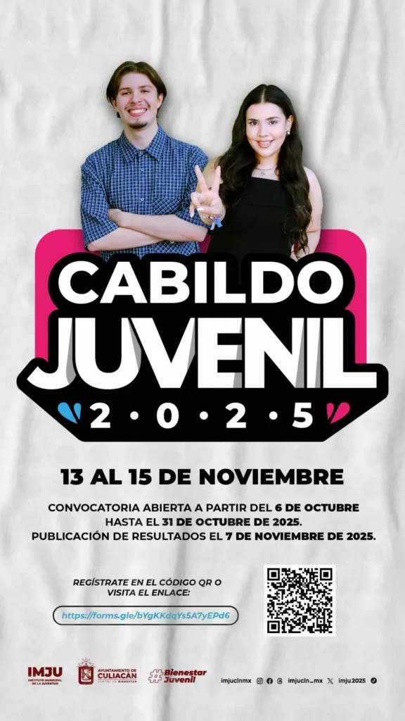 Podrán participar jóvenes de 12 a 29 años que residan en Culiacán, quienes deberán registrarse en la página oficial del Ayuntamiento www.culiacan.gob.mx, en el apartado “Cabildo Juvenil 2025”, antes de las 23:59 horas del 31 de octubre del presente año.