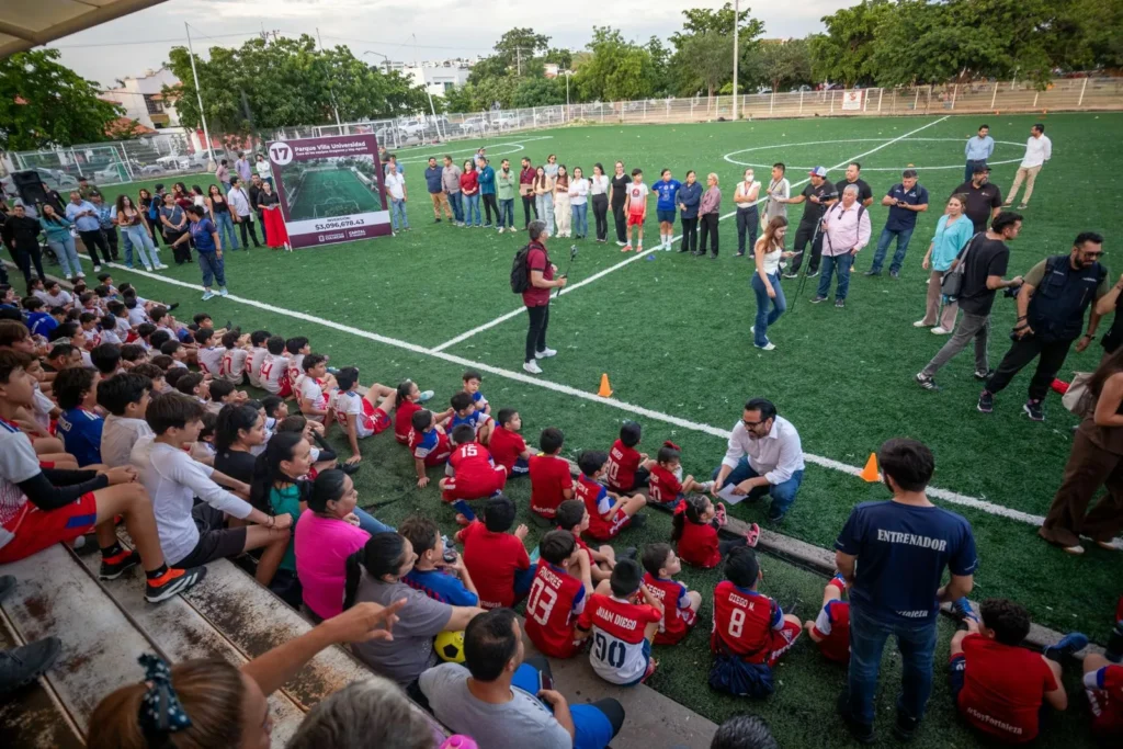 Culiacán, Sin., a 08 de octubre de 2025.- En medio de un gran ambiente de entusiasmo y alegría por parte de niñas, niños, jóvenes y familias, el alcalde Juan de Dios Gámez Mendívil hizo entrega de la cancha de fútbol de pasto sintético número 17 construida durante su administración, ubicada en la colonia Villa Universidad, cumpliendo así el compromiso que asumió con los deportistas del sector de entregarla este mismo año.