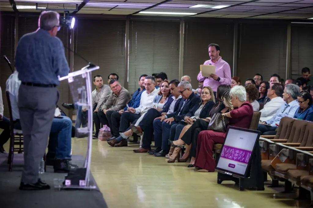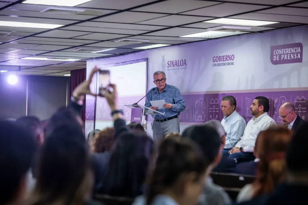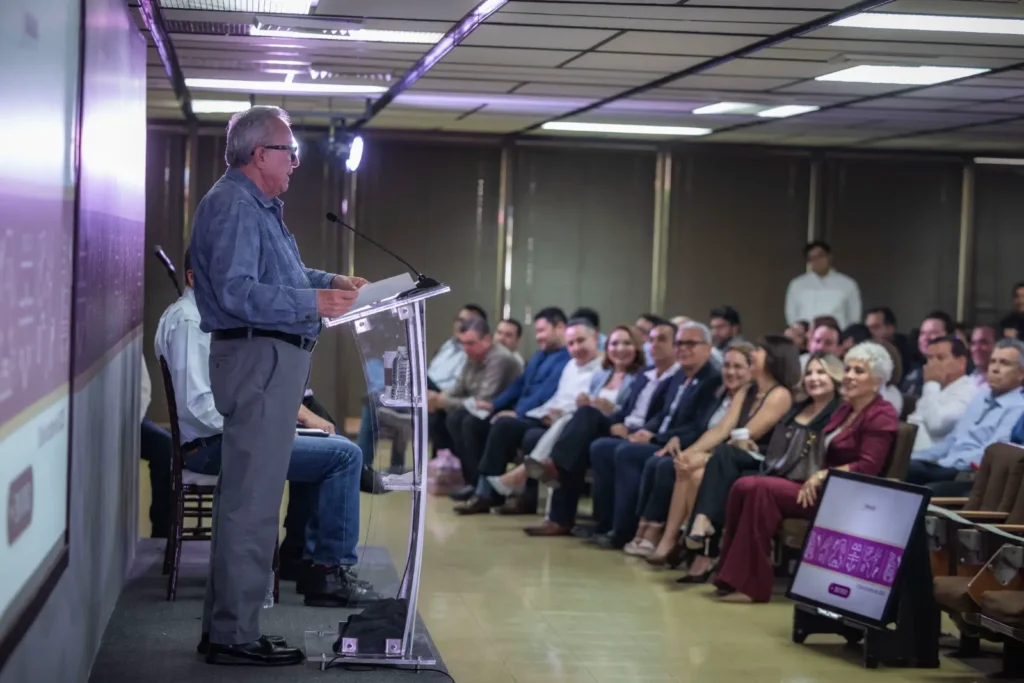 Durante la conferencia, el secretario de Economía, Ricardo Velarde Cárdenas, enfatizó que el desarrollo económico se construye en equipo y que el comercio y los servicios son los sectores que más impulsan la economía sinaloense.