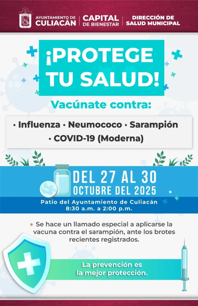 Culiacán, Sinaloa, octubre de 2025.- Con el propósito de fortalecer la salud de la ciudadanía, la Dirección de Salud Municipal inició la jornada ¡Protege tu salud!, con la aplicación de las vacunas contra el sarampión, influenza, neumococo y covid-19.