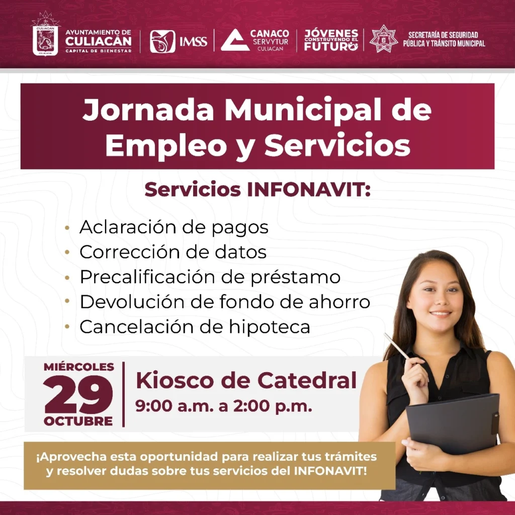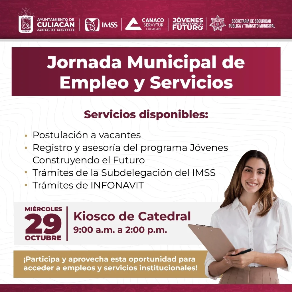 La Jornada Municipal de Empleo y Servicios se realizará el miércoles 29 de octubre, en el Kiosco de la Catedral, en un horario de 9:00 de la mañana a 2:00 de la tarde. Participarán reclutadores de CANACO SERVyTUR Culiacán, Crazy Motors, Enagri, Teresita, Ferrox, OXXO y de la Secretaría de Seguridad Pública y Tránsito Municipal, entre otras.