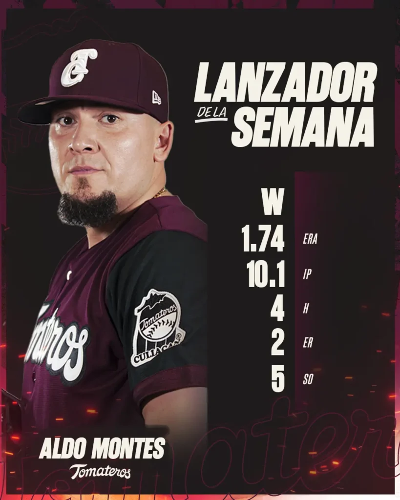 El derecho Aldo Montes volvió a demostrar su calidad y temple en la loma al firmar una semana con buena actividad, en diez entradas y un tercio de labor, Montes registró efectividad de 1.74, permitiendo solo cuatro imparables, dos carreras limpias y cinco ponches repartidos a lo largo de sus dos aperturas.