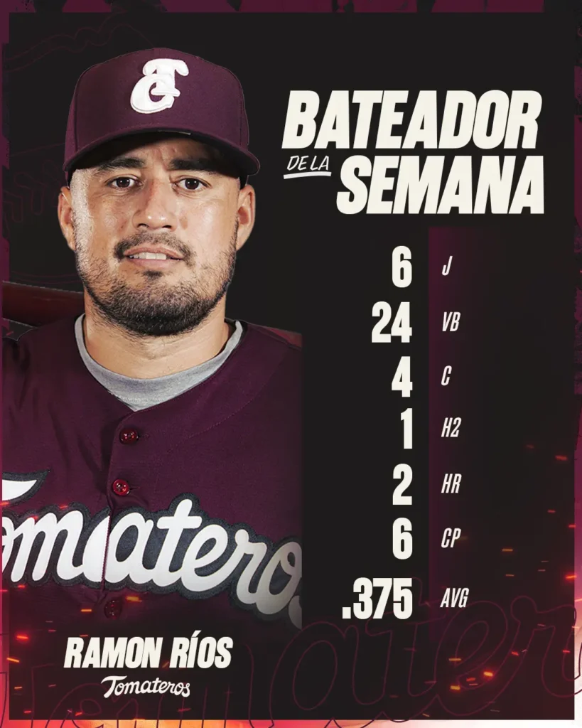 La veteranía de Ríos y su capacidad para responder en situaciones clave lo han consolidado como un motor ofensivo para la novena dirigida por Roberto Vizcarra, aportando liderazgo dentro y fuera del terreno. Martes 28, miércoles 29 y jueves 30 de octubre los Tomateros visitan a los Naranjeros en el Estadio Sonora, enfrentamiento que revive una histórica rivalidad del béisbol mexicano, llena de duelos memorables y pasión que une generaciones. Cada choque entre guindas y naranjas es más que una serie: es otro capítulo en la historia de dos equipos emblemáticos.