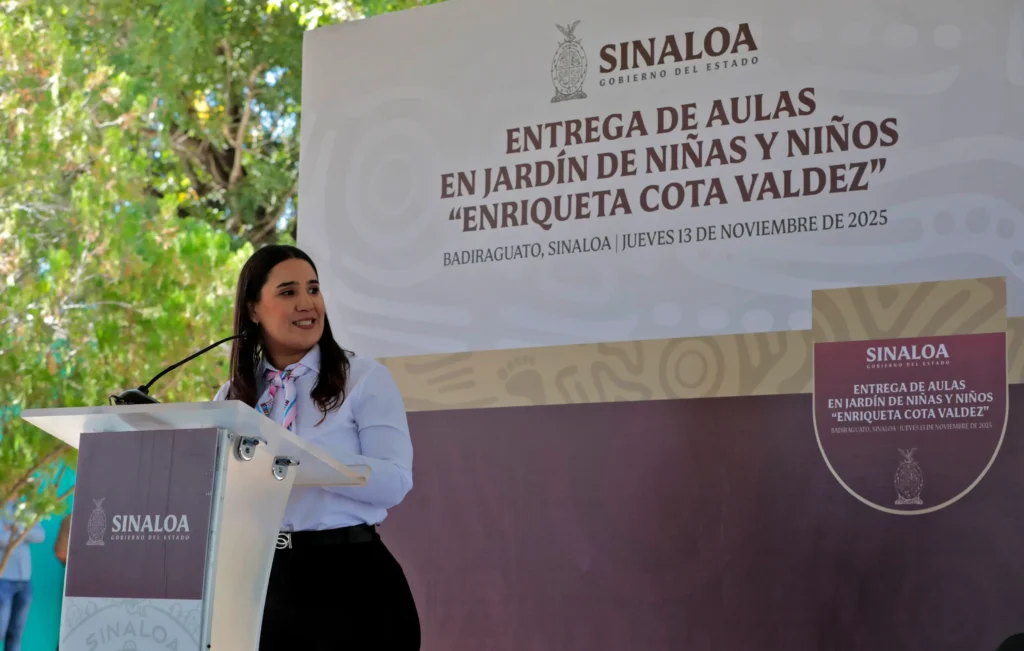 Badiraguato, Sinaloa, noviembre de 2025.- El gobernador Rubén Rocha Moya visitó la cabecera municipal de Badiraguato, para entregar en compañía del presidente municipal, José Paz López Elenes, tres aulas del Jardín de Niños “Profesora Enriqueta Cota Valdez”, así como la entrega de enseres de cocina para el programa de desayunos calientes, obras y mobiliario en las que se invirtieron 4 millones 100 mil pesos.