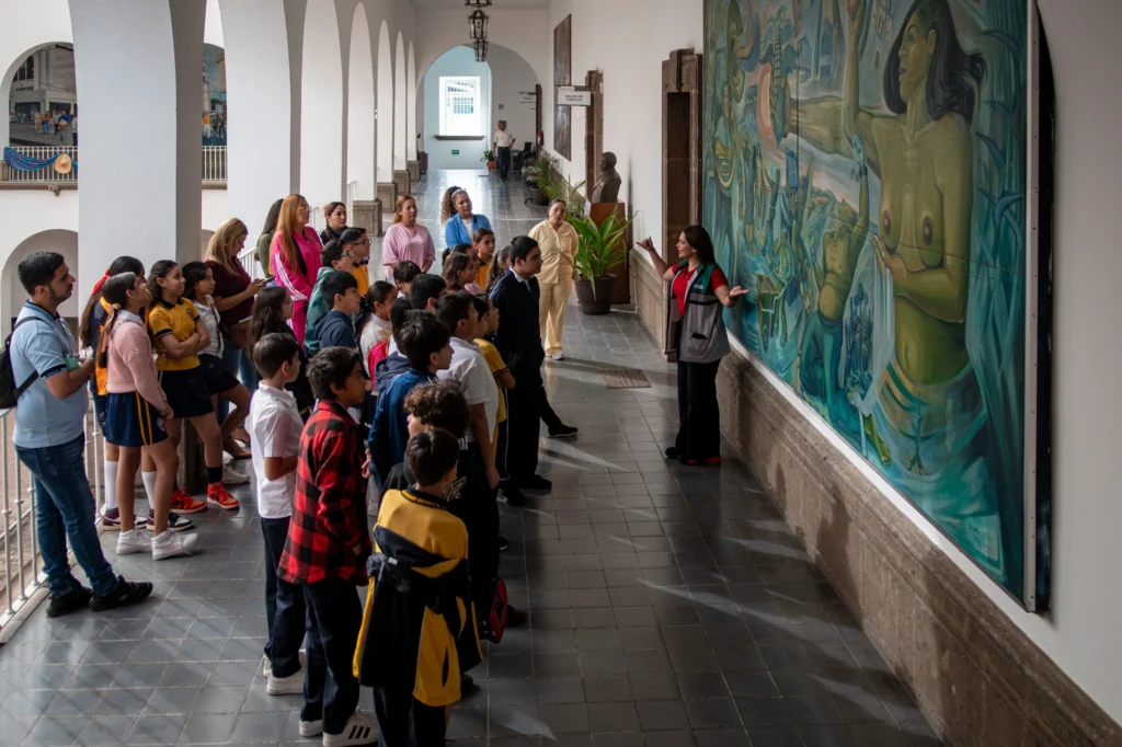 Durante la visita guiada, los estudiantes recorrieron los pasillos del Palacio Municipal, donde recibieron información sobre la historia del edificio desde su fundación hasta la actualidad. Además, conocieron los murales y espacios más representativos del recinto, entre ellos el Salón de Cabildo, donde pudieron aprender sobre el proceso mediante el cual se deliberan y aprueban las decisiones que dan rumbo a la ciudad.