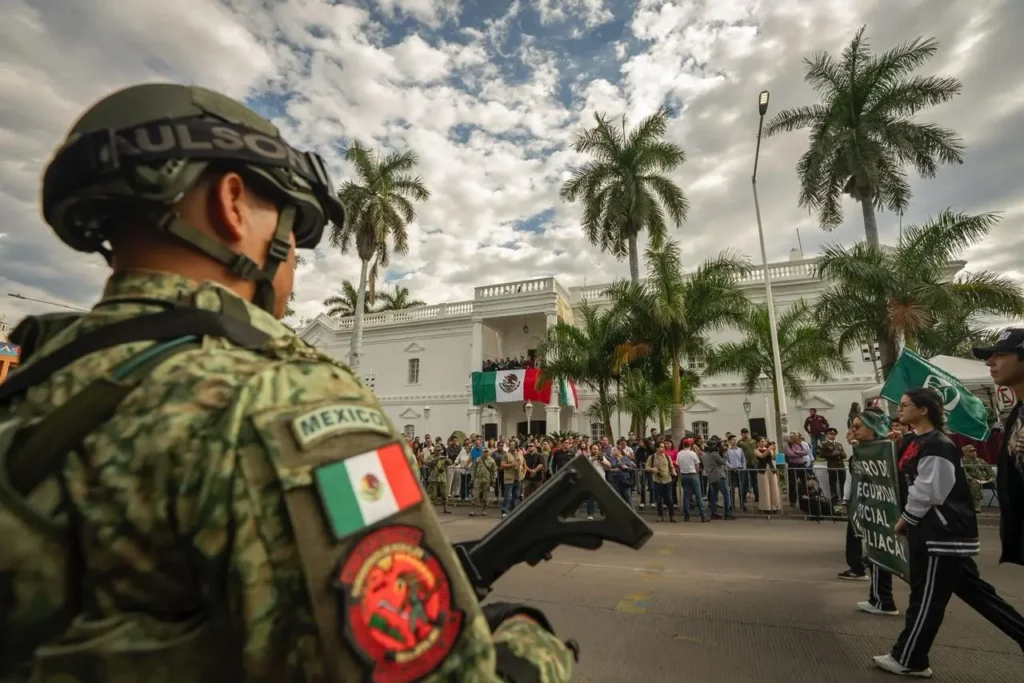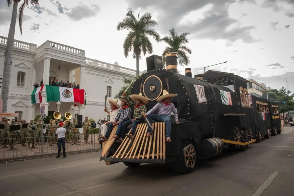Desde el balcón del Ayuntamiento, el alcalde Juan de Dios Gámez Mendívil, acompañado por el gobernador del estado Rubén Rocha Moya, el cuerpo de regidores, la síndica procuradora y autoridades militares, observó la ceremonia protocolaria mientras los contingentes avanzaban por la avenida Álvaro Obregón.