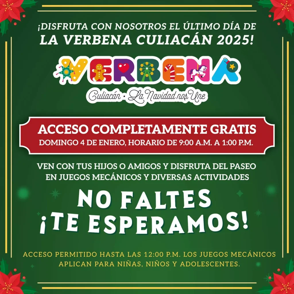 Culiacán, Sinaloa, enero de 2026.- La Verbena Popular Culiacán invita a las familias a disfrutar de sus atractivos de manera gratuita este domingo 4 de enero de 2026, como parte del cierre de actividades de la temporada.