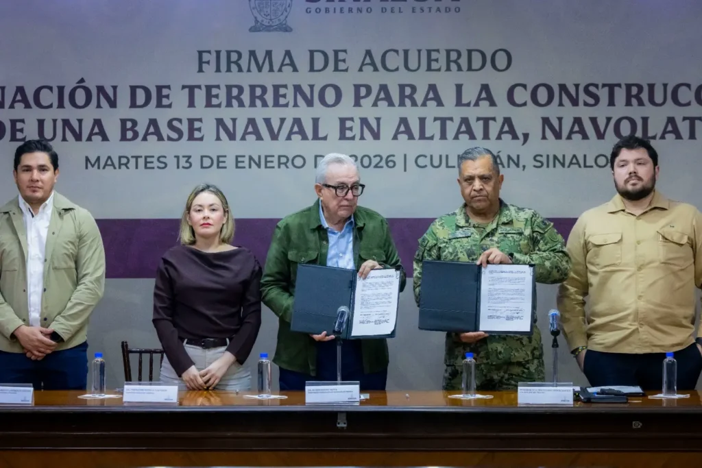 Culiacán, Sinaloa, enero de 2026.- Para concretar el proyecto de la instalación de un Sector Naval en Nuevo Altata, en el municipio de Navolato, el gobernador Rubén Rocha Moya signó un acuerdo de donación de un predio con el comandante de la Cuarta Región Naval, vicealmirante José Daniel Reséndiz Sandoval, lo cual vendrá a dar mayor seguridad y confianza tanto a residentes como visitantes de este destino turístico, con la presencia permanente de mil 100 elementos de la Secretaría de Marina.