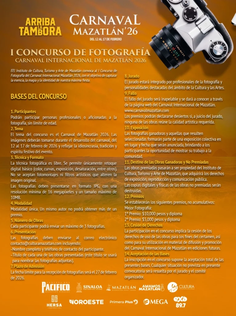 Esta convocatoria, impulsada por el Instituto de Cultura, Turismo y Arte de Mazatlán y coordinada por el fotógrafo y artista visual Iván Lizárraga, invita a personas profesionales y aficionadas a la fotografía, sin límite de edad, a capturar la esencia, la magia y la identidad del Carnaval más alegre del Pacífico mexicano.