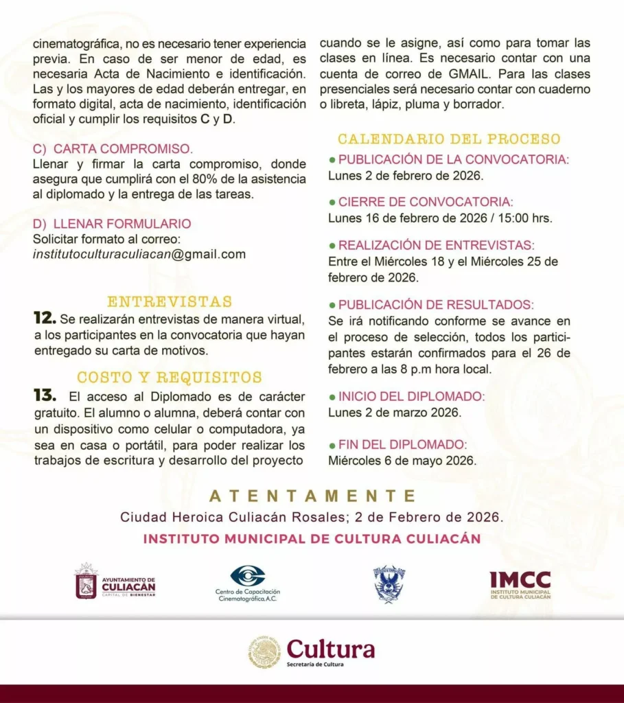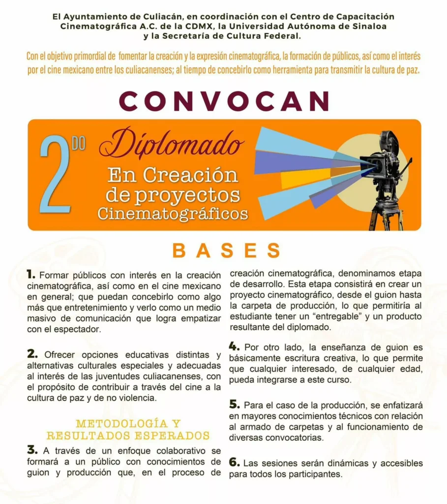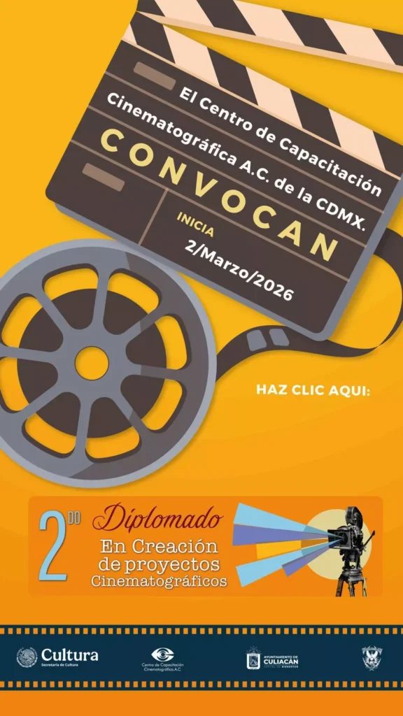 Culiacán, Sinaloa; a 02 de febrero de 2026.- El Ayuntamiento de Culiacán, en coordinación con el Centro de Capacitación Cinematográfica A.C. de la Ciudad de México, la UAS y la Secretaría de Cultura federal, convocan al Segundo Diplomado en Creación de proyectos Cinematográficos dirigido a personas mayores de 15 años.