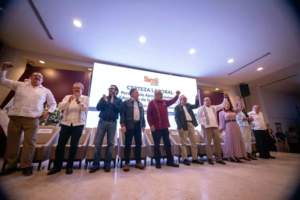 Culiacán, Sinaloa, febrero de 2026.- El gobernador de Sinaloa, Rubén Rocha Moya, en conjunto con el dirigente nacional del SNTE, Alfonso Cepeda Salas, reconoció el esfuerzo de educadoras y educadores en la formación de niñas, niños y jóvenes, durante el acto de entrega de mil 58 bases al Personal de Apoyo y Asistencia a la Educación en la entidad.