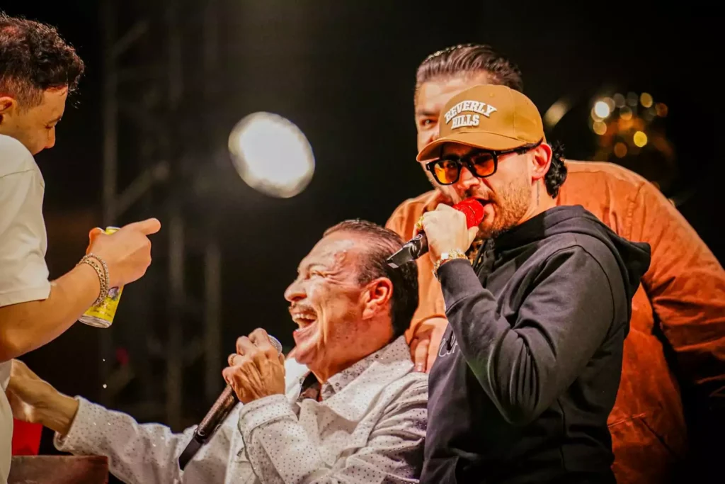 “El Gigante de la Banda” puso a cantar al público con clásicos como: “Mi gusto es”, “Leña de Pirul”, “El Palomito”, y “Un rinconcito en el cielo”, para después junto a “El Flaco” interpretar “Soy de Mazatlán”, causando euforia entre los presentes.