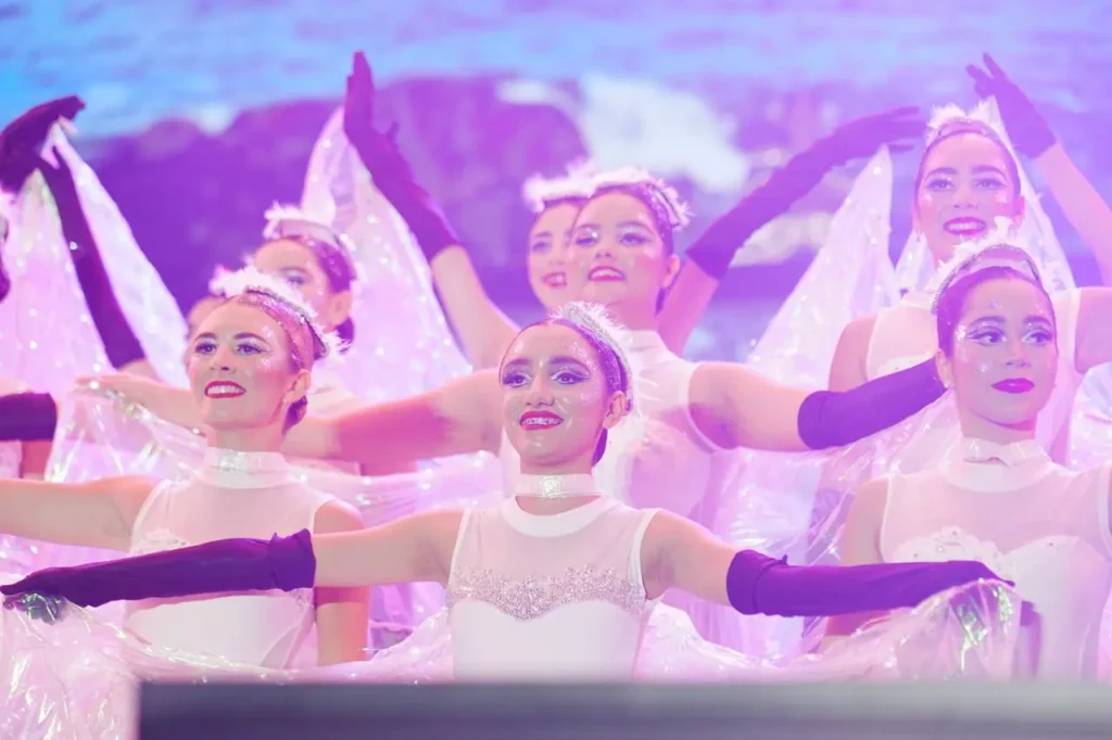 Bajo el título “Cuando el mar trajo la tambora”, la ceremonia inició con un escenario envuelto en penumbra y el sonido del mar como fondo, dando paso a una narración poética que evocó a Mazatlán como cuna de historias que nacen entre olas y se bailan al ritmo de la tambora. Telas en distintas tonalidades de azul, proyecciones de cielo y gaviotas, y coreografías que simulaban el vaivén del mar, construyeron una atmósfera mágica desde el primer instante.