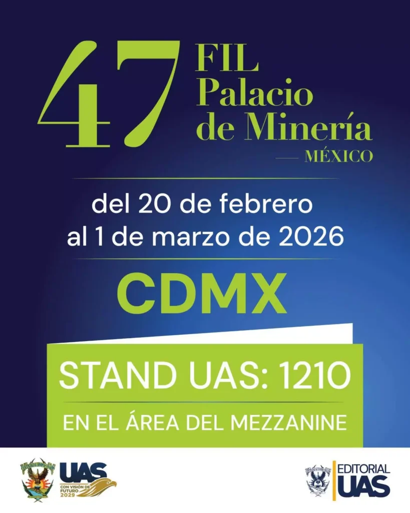La Universidad Autónoma de Sinaloa (UAS) da inicio a su agenda literaria de este año con su participación en la 47.ª edición de la Feria Internacional del Libro del Palacio de Minería, que se llevará a cabo del 20 de febrero al 1 de marzo en el icónico edificio que ocupa este centro cultural y académico, en el Centro Histórico de la CDMX.