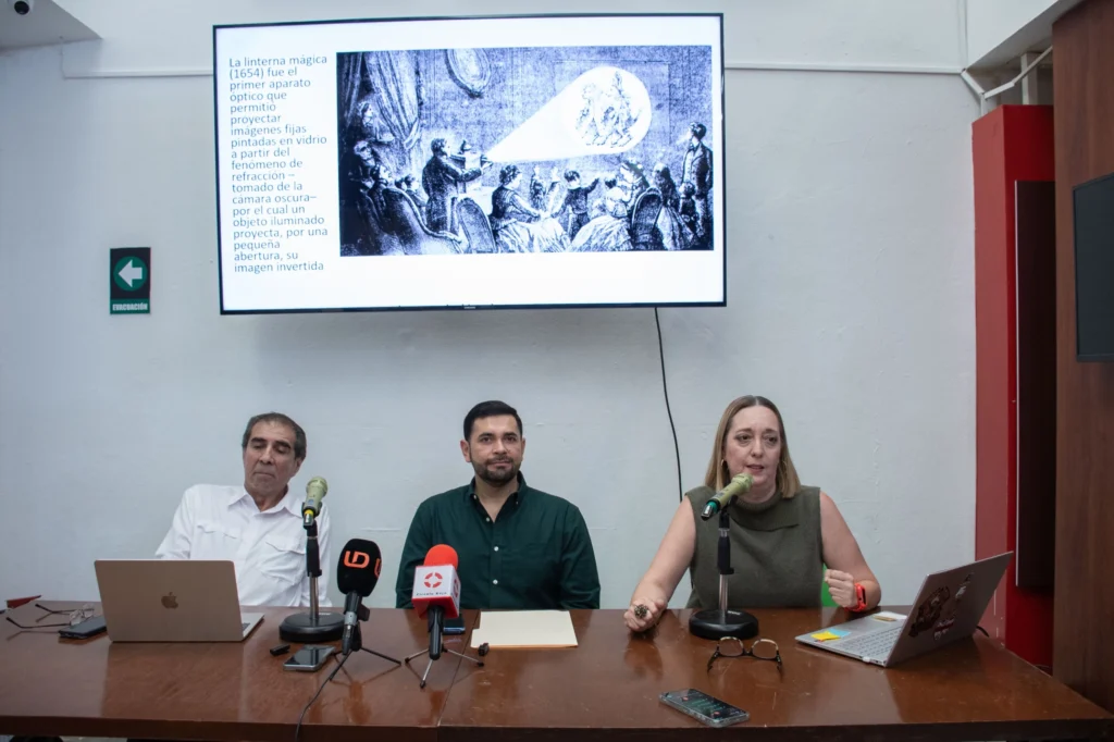 La conferencia abordó el desarrollo histórico de la forma de hacer cine, desde la técnica de refracción, el kinetoscopio y el impacto de los hermanos Lumière, hasta la generación de imágenes en movimiento y el fenómeno del cine móvil operado por los denominados “húngaros”.