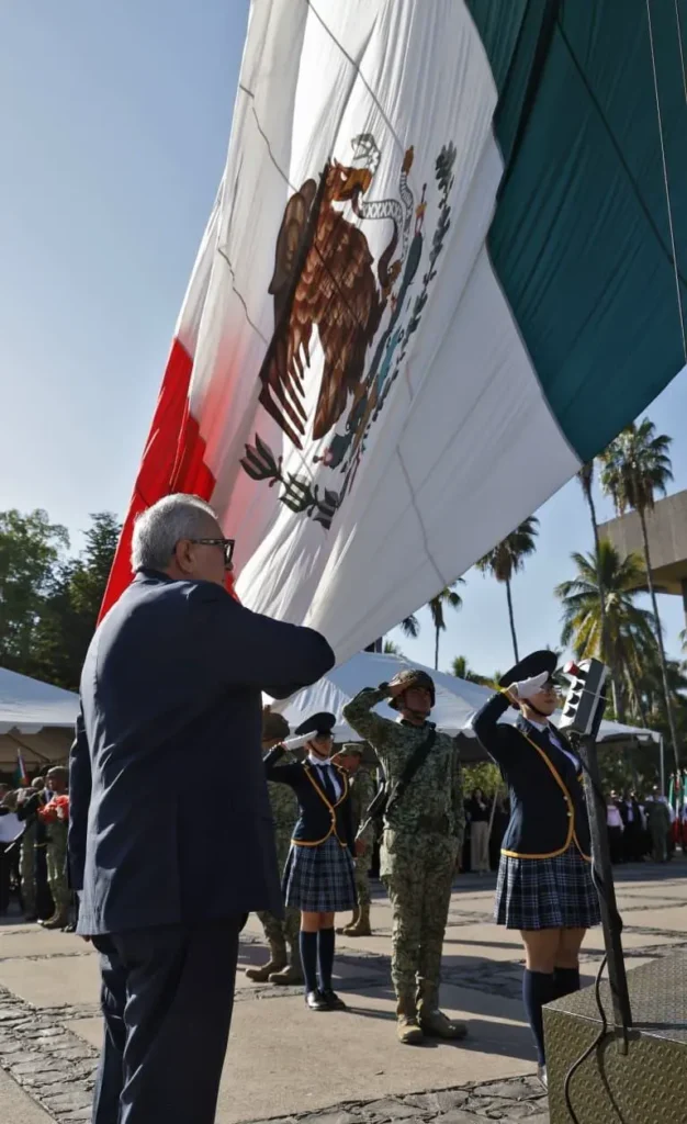 Acompañado por el comandante de la Novena Zona Militar, general de Brigada, Santos Gerardo Soto, y por demás autoridades civiles y militares, el gobernador Rocha presidió este evento cívico en la explanada de Palacio de Gobierno, para honrar a nuestra enseña nacional y máximo símbolo de identidad y patriotismo de las y los mexicanos.