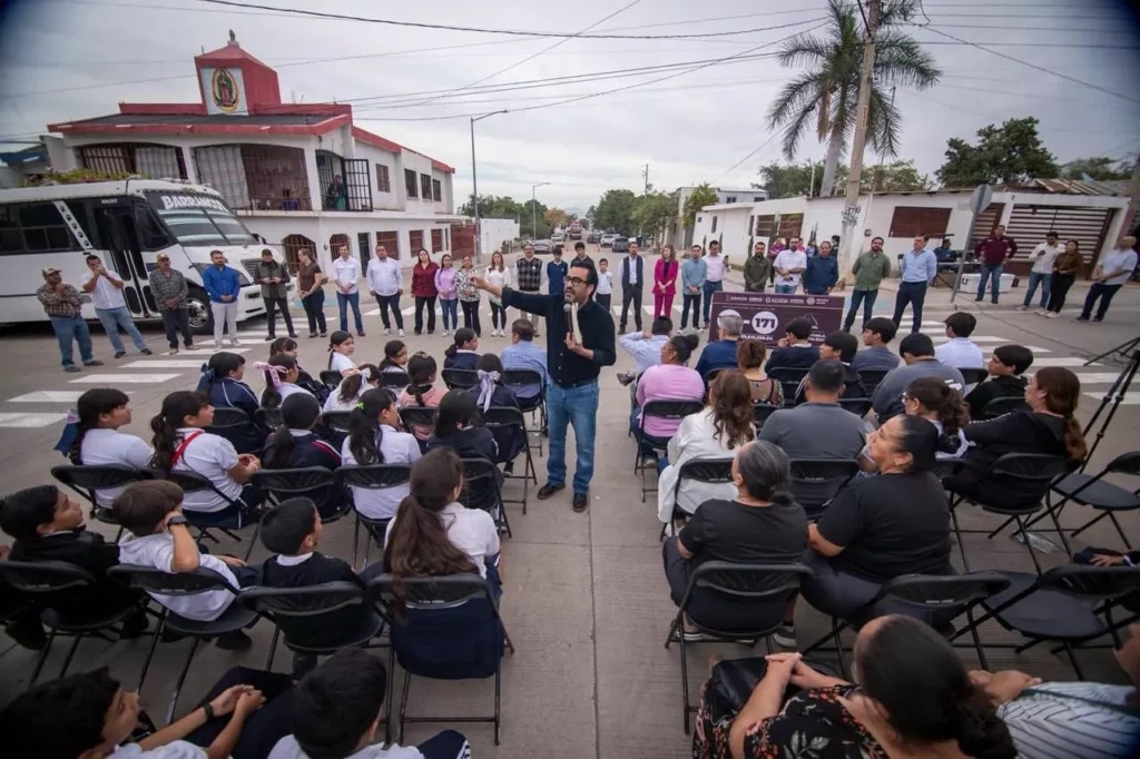 Durante su visita, acompañado por vecinos y alumnas y alumnos de la escuela primaria Lázaro Cárdenas, en la colonia Esthela Ortiz, donde entregó cinco tramos de las calles Constituyente Rafael Martínez Escobar y avenida General Maximiliano Gámez, el presidente municipal precisó que el tema educativo es una prioridad para la administración que encabeza.
