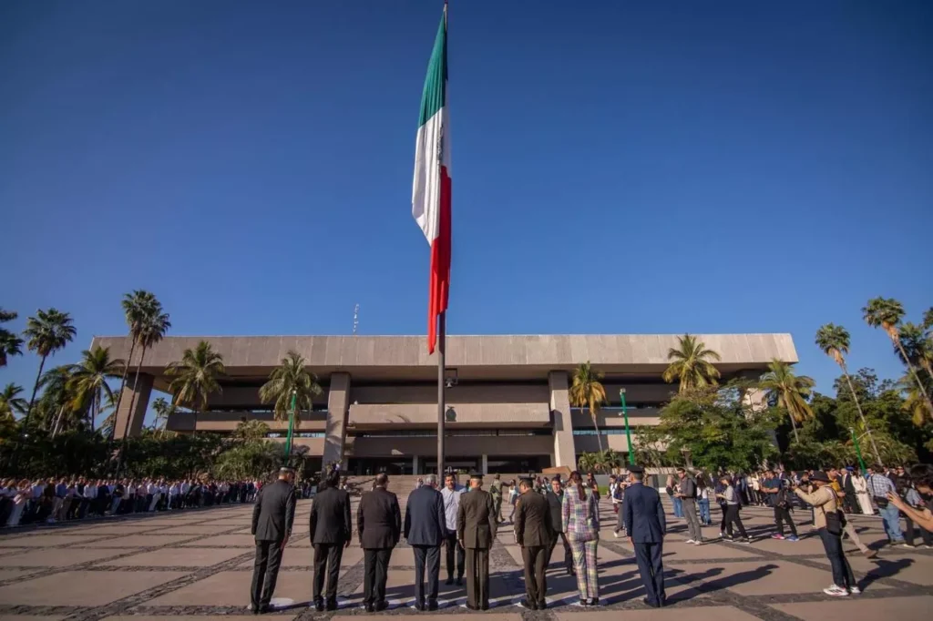 Culiacán, Sinaloa,marzo de 2026.– El alcalde de Culiacán, Juan de Dios Gámez Mendívil, participó en el acto cívico de izamiento de bandera realizado en la plaza cívica del Palacio de Gobierno, en el marco del 220 aniversario del natalicio de Benito Juárez.