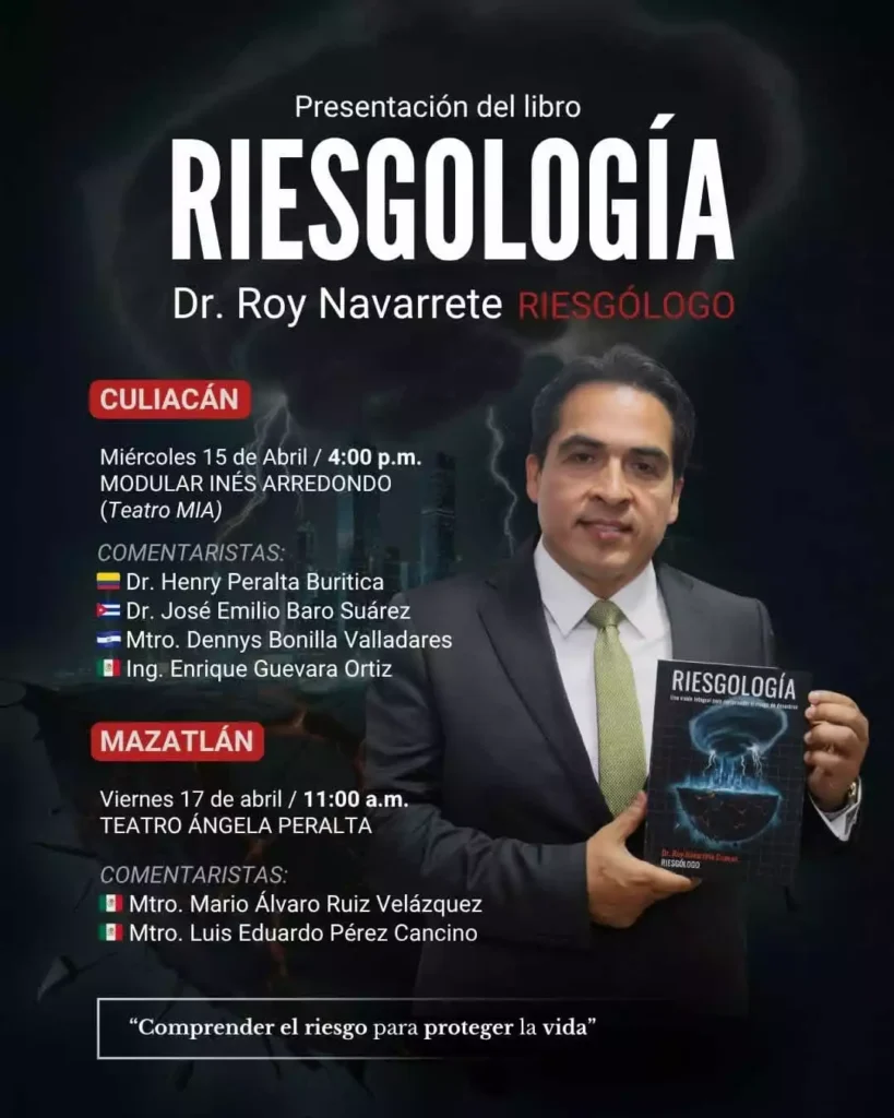 Mazatlán, Sinaloa, abril de 2026.- Con la experiencia y el liderazgo que ha adquirido al dirigir el Sistema Estatal de Protección Civil, y convencido de generar una cultura de prevención, el Doctor Roy Navarrete Cuevas escribió su primer libro “Riesgología. Una visión integral para comprender el riesgo de desastres”, obra que será presentada este viernes 17 de abril a las 11:00 horas en el Teatro Ángela Peralta.